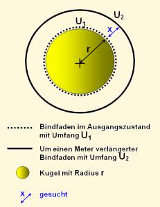 Anmerkung: Für Kugel und Bindfaden wird eine ideale Anordnung angenommen: Die Kugel ist rund, der Bindfanden liegt im Ausgangszustand genau auf dem Äquator der Kugel, nach Verlängerung um 1,00m hat der Faden immer noch eine exakte Kreisform usw.